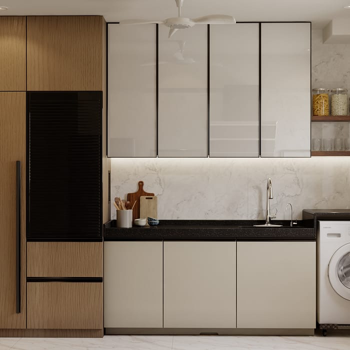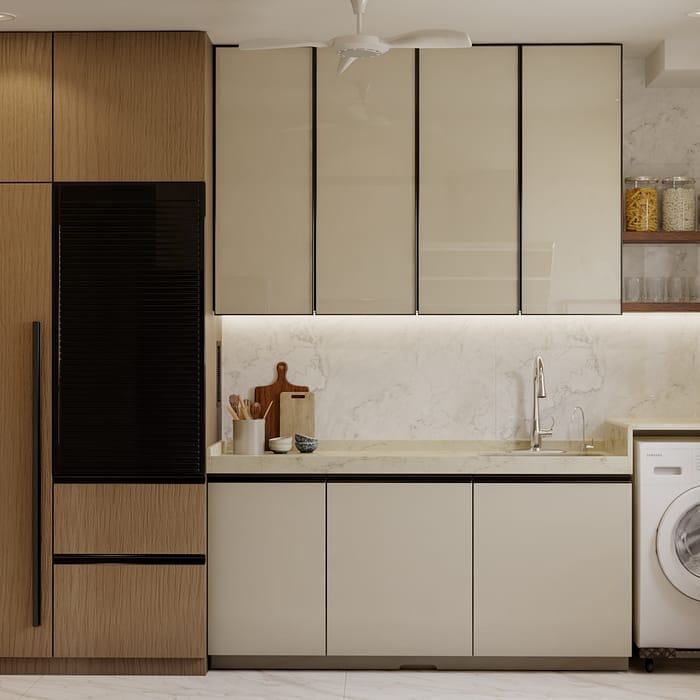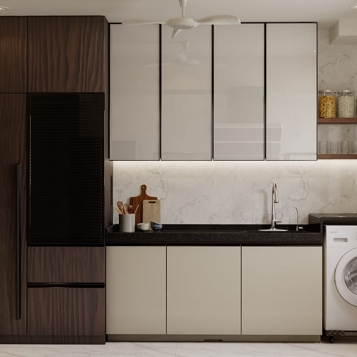 Maximizing space in this compact kitchen while adhering to basic vastu principles was of utmost importance. We included a pantry and a gadget garage with a rolling shutter to optimize storage. An under-counter water purifier and strategically placed open shelves were integrated to prevent clutter and maintain an organized, efficient workspace.