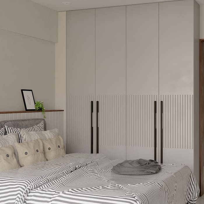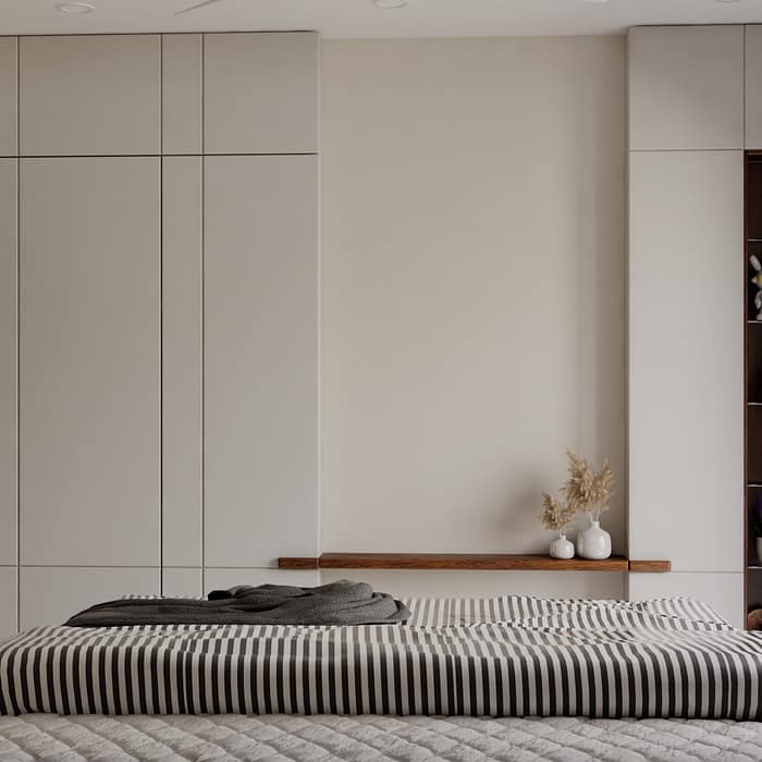 Several ingenious features enhance both functionality and aesthetics in the bedroom. We have added a seamlessly hidden bathroom door, with a cabinet adjacent to it which discreetly stores used clothes, keeping the space neat. Another solution disguises a column with a cabinet housing a folding ironing board, enhancing space utilisation. On the opposite side, an integrated ledge behind the bed elegantly balancestwo column projections, providing additional storage and featuring a niche that acts as a built-in side table, where a freestanding one wouldn't be feasible.