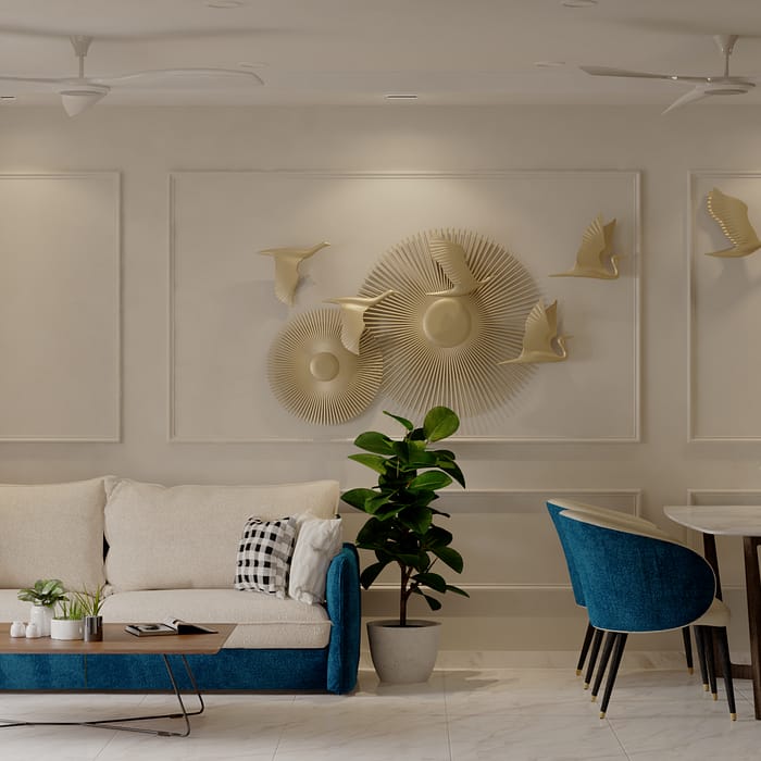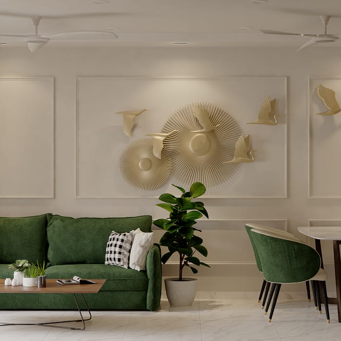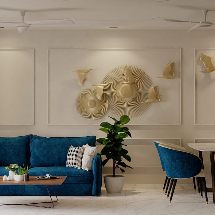 A key requirement from the client was to incorporate an additional bed for visiting family members or guests. Given the 1 BHK layout, we addressed this need by adding a sofa cum bed in the living room. To enhance the sense of space, we also integrated a patterned mirror on an entire wall next to the dining table, creating the illusion of a larger room.